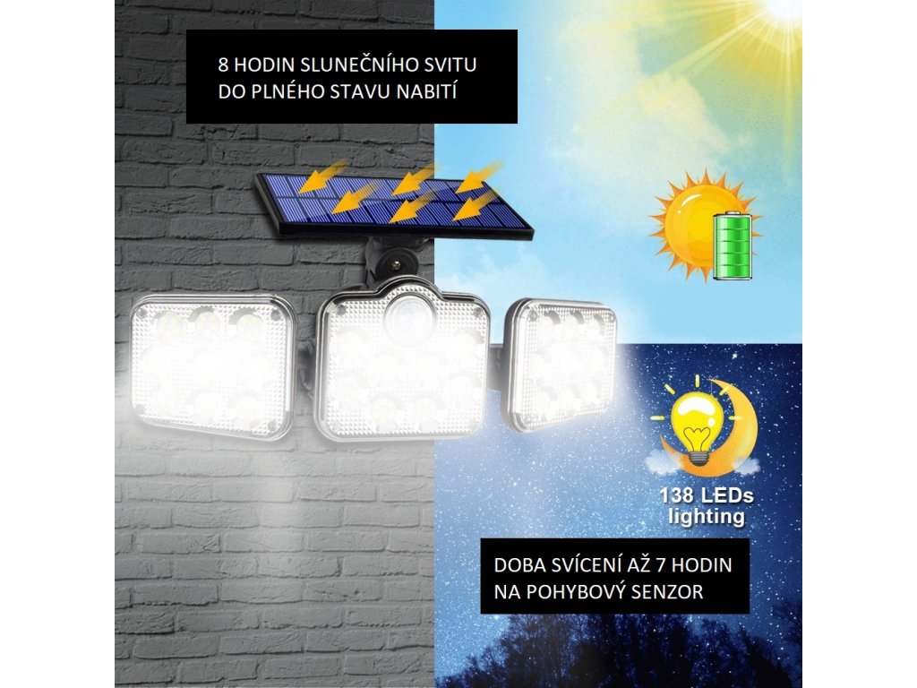 Solární LED světlo, senzor pohybu, 138 LED diod, IP65